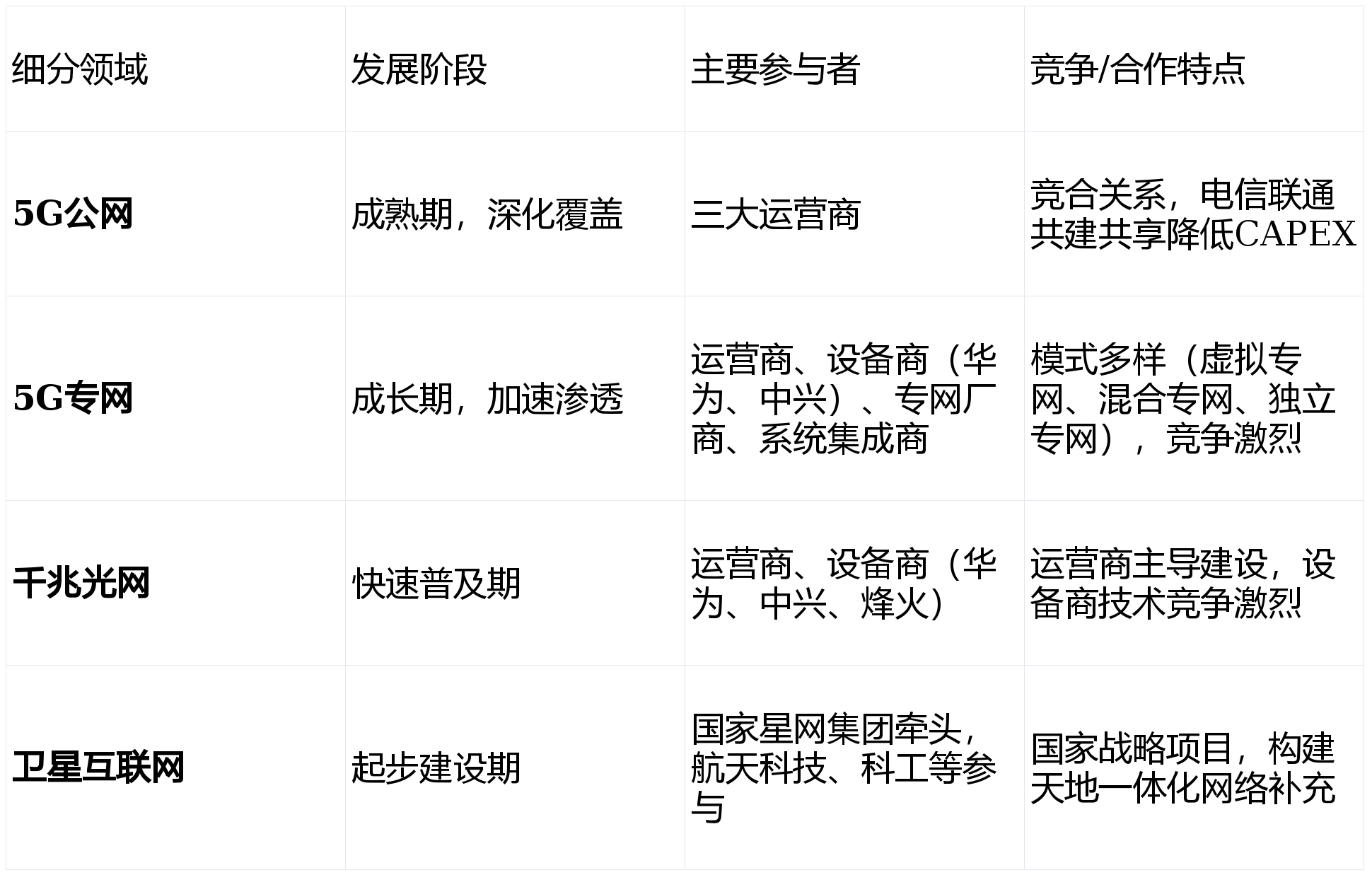 :中国移动、电信、联通三大国资运营商是网络投资与运营的绝对主体,但其正从“管道提供商”向“综合服务集成商”转型,与设备商、云服务商、垂直行业伙伴共建生态。